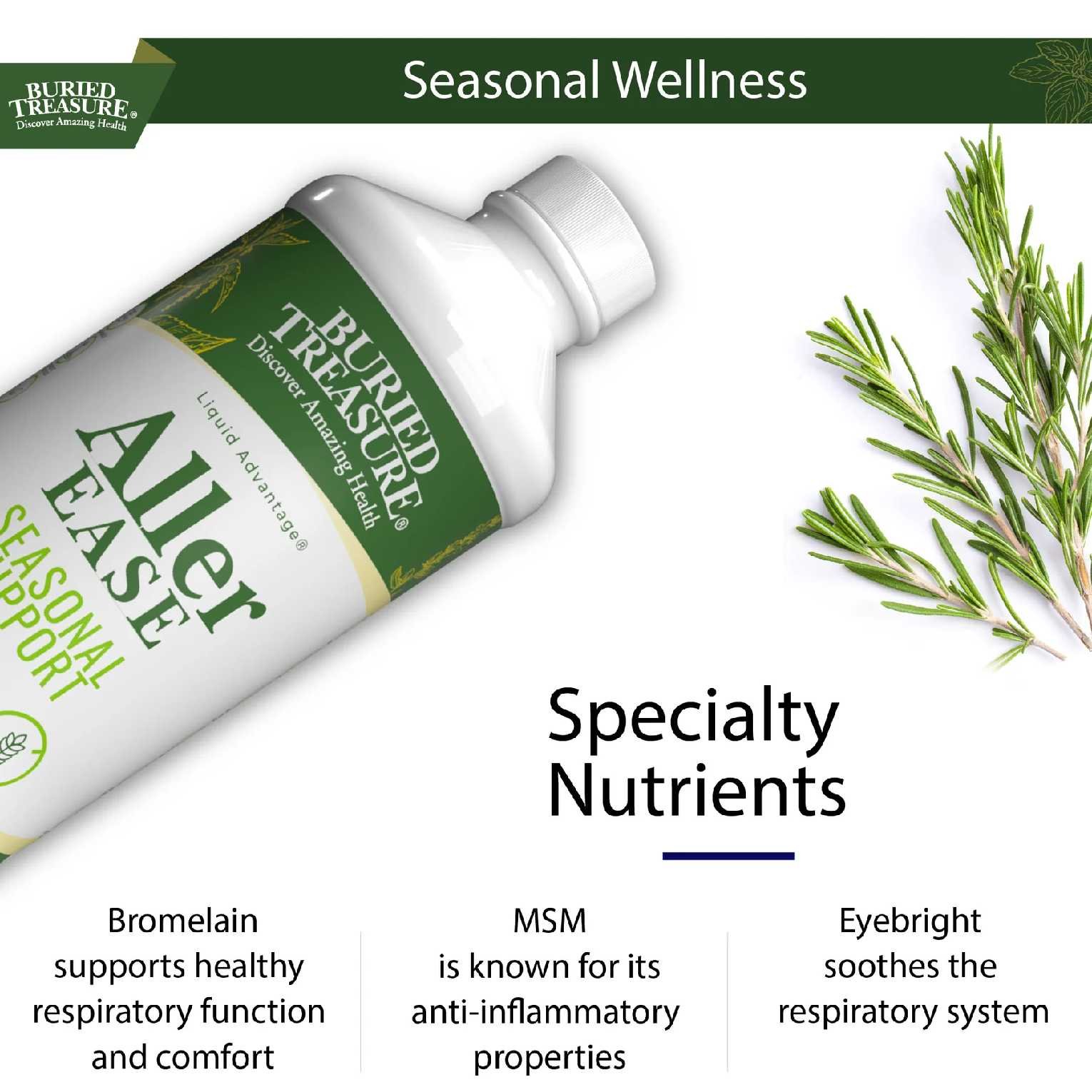 Buried Treasure's Aller Ease is your go-to liquid supplement for maintaining healthy respiratory function and supporting your immune system during seasonal changes and environmental challenges. Our unique blend includes essential vitamins and herbal extracts known for their beneficial effects on respiratory health and immune function.