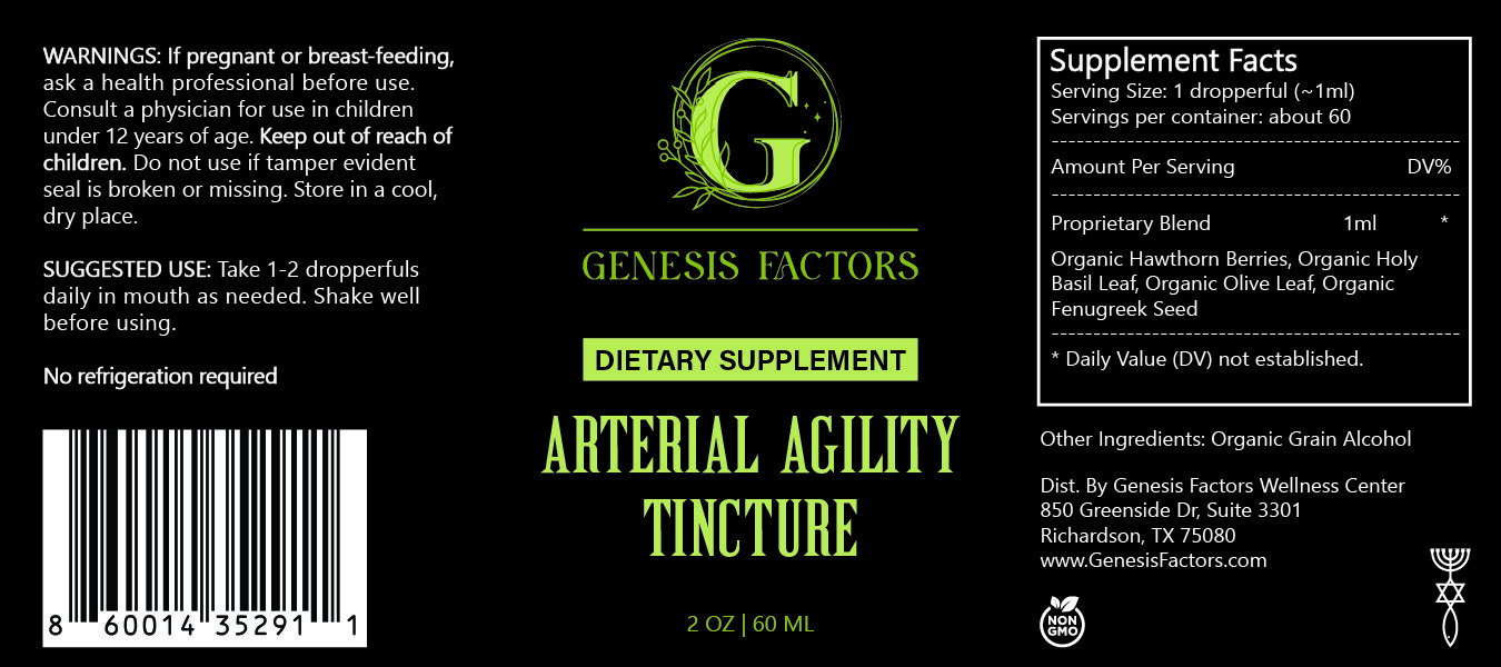 Genesis Factors Arterial Agility Tincture is a natural, organic solution that supports arterial health and promotes optimal heart function. Its carefully selected ingredients work synergistically to enhance circulation, reduce inflammation, and protect against cardiovascular stress.