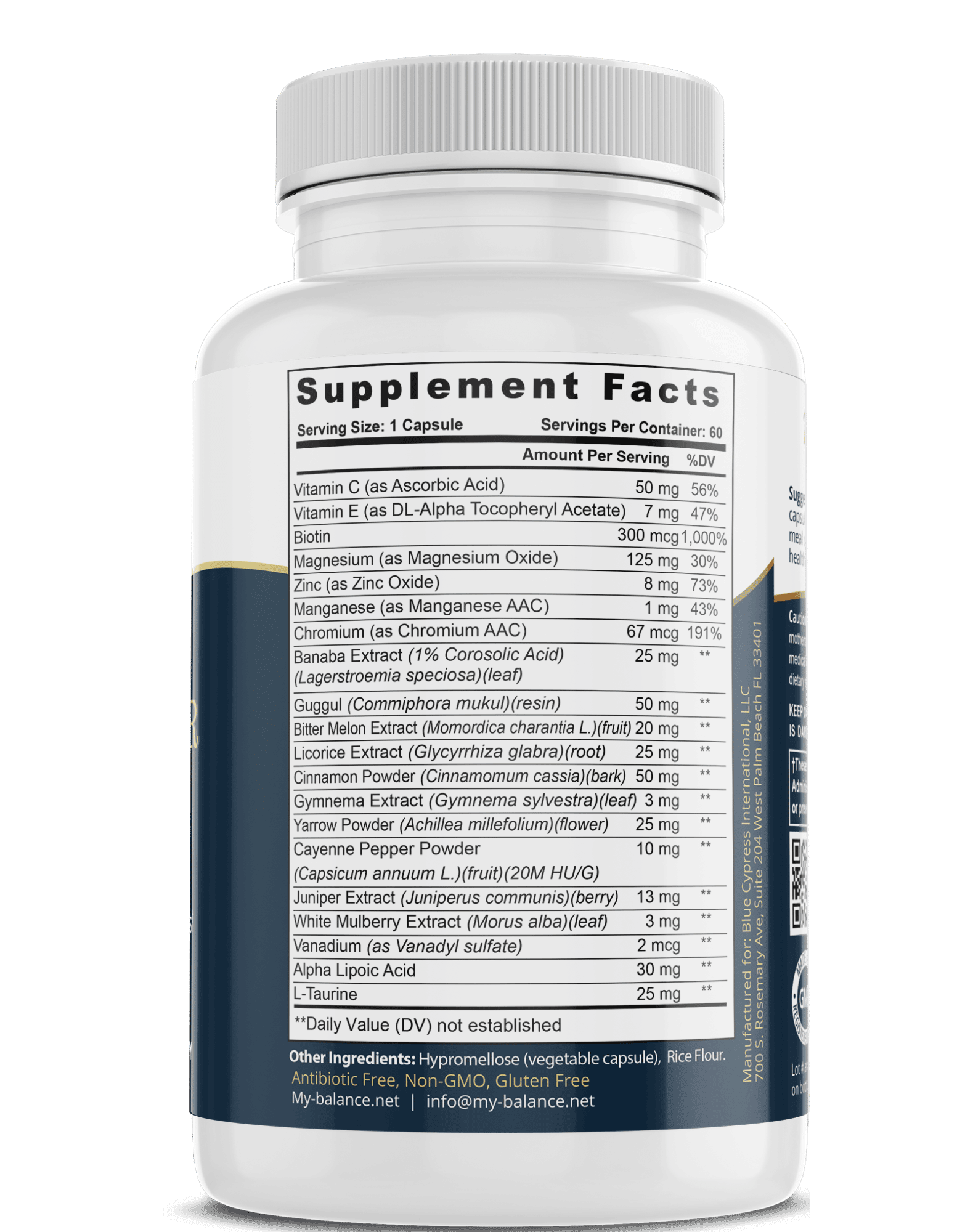 Blood Sugar Control Supplement, Vitamin C, Vitamin E, Biotin, Chromium, Banaba Extract, Guggul, Bitter Melon Extract, Cinnamon Powder, Gymnema Extract, Yarrow Powder, Cayenne Pepper Powder, Juniper Extract, White Mulberry Extract, Vanadium, Alpha Lipoic Acid, L-Taurine, Healthy Metabolism, Nutritional Supplement.