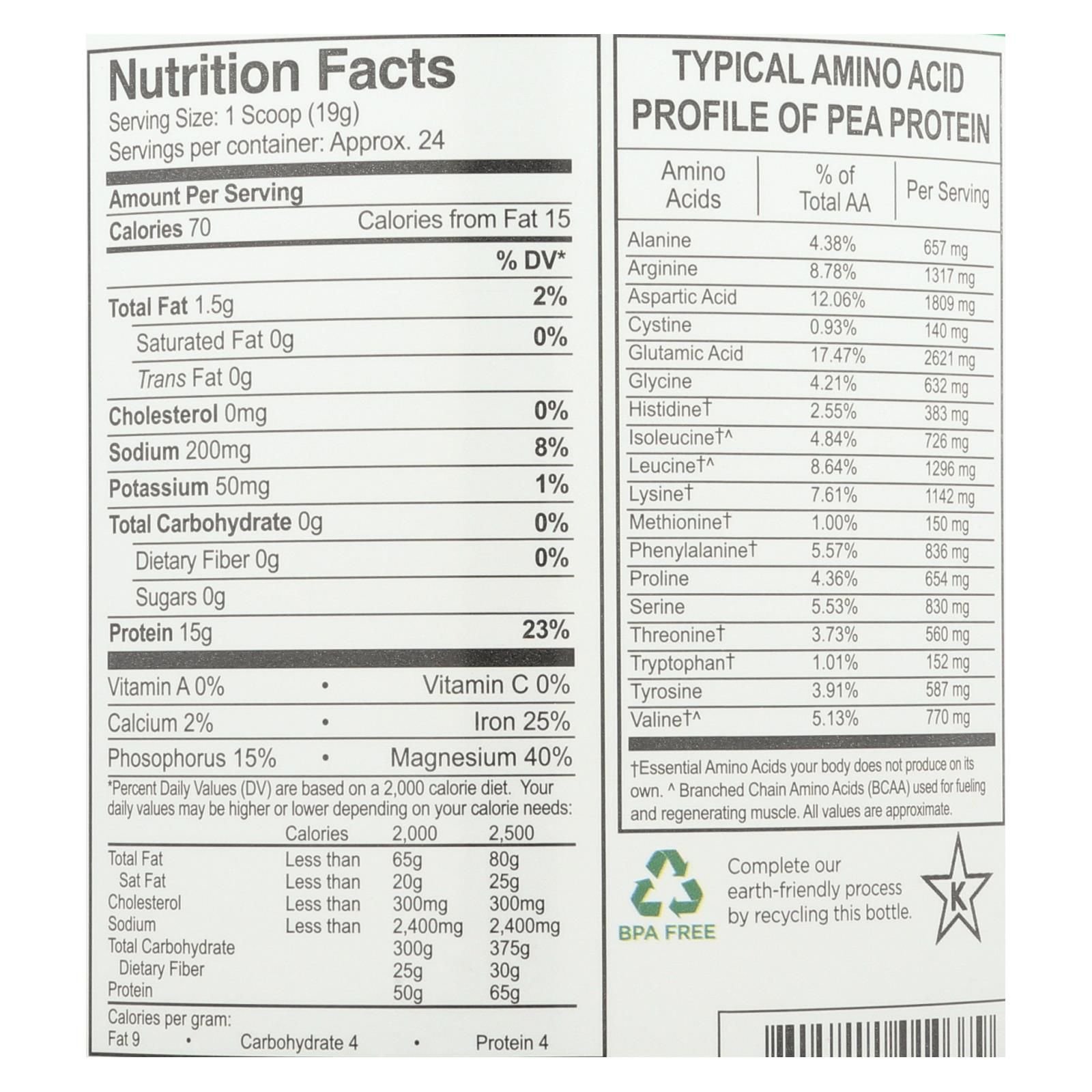 Growing naturals pea powder has 15 g. Of protein per serving with 0 g. Of sugar or cholesterol, so it's a healthy source of vegetable-based protein. There are also 0 g. Of carbohydrates in this powder for people following a low-carb diet. This 16 oz. Container of original-flavor powder has 25% of your daily value of iron. The formula is smoother for creamier shakes that are easy to mix and digest.