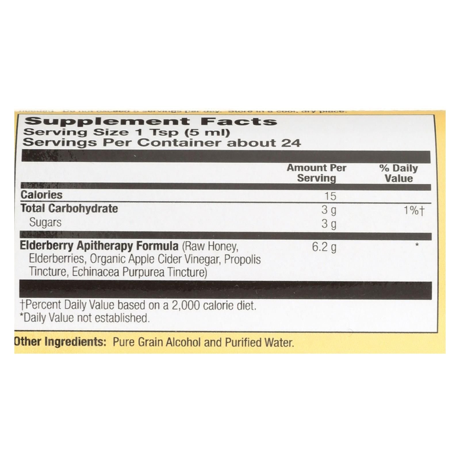 Honey gardens traditional immune formula elderberry syrup herbal supplement provides you with a custom blend of nutrients, including raw honey, apple cider vinegar and propolis. To use, take one tsp. Every two hours as needed. This bottle contains 4 fl. Oz. Of elderberry syrup herbal supplement with approximately 24 servings.