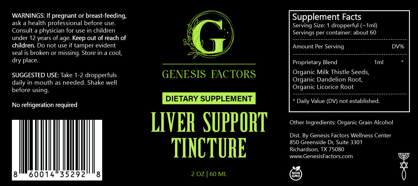 Genesis Factors Liver Support Tincture is a natural, organic solution designed to support and promote liver health. Its carefully selected ingredients work synergistically to detoxify, repair, and rejuvenate the liver.