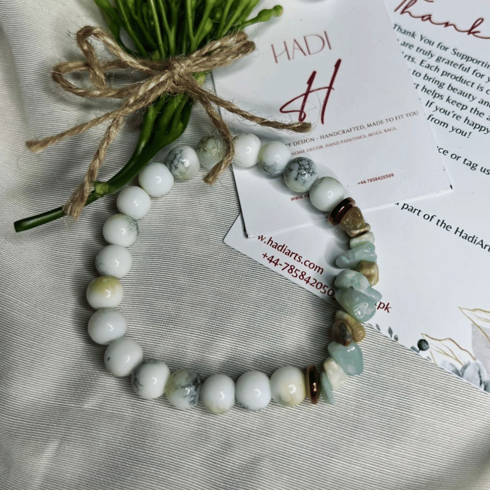 This handcrafted bracelet beautifully blends the calming energy of polished White Howlite with the soothing hues of natural Amazonite chip beads. The smooth white beads, subtly marbled with soft grey and yellow tones, are complemented by the raw, organic texture of Amazonite, symbolizing harmony and peace. Accented with warm bronze-toned spacers, this bracelet adds an earthy, elegant touch to any outfit. Measuring 7.25 inches (18.4 cm) in length, it features a comfortable stretch fit, making it ideal for everyday wear, meditation, or as a thoughtful gift.