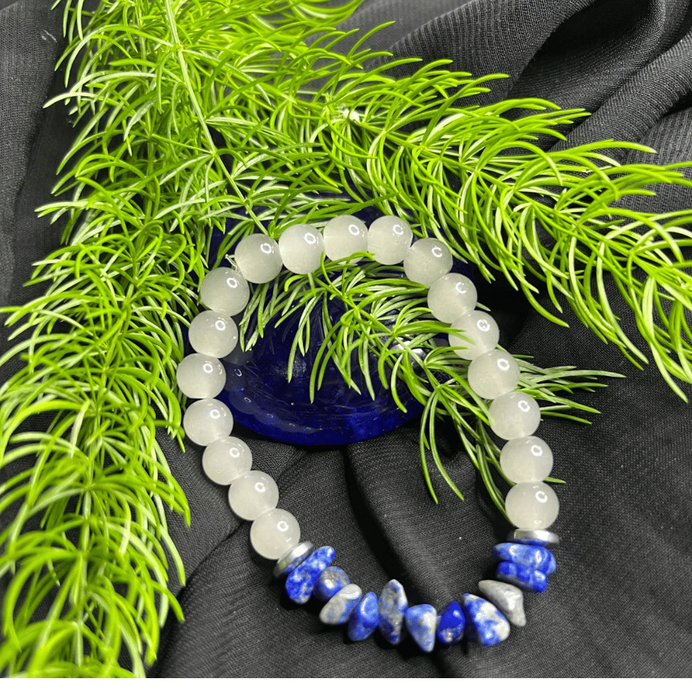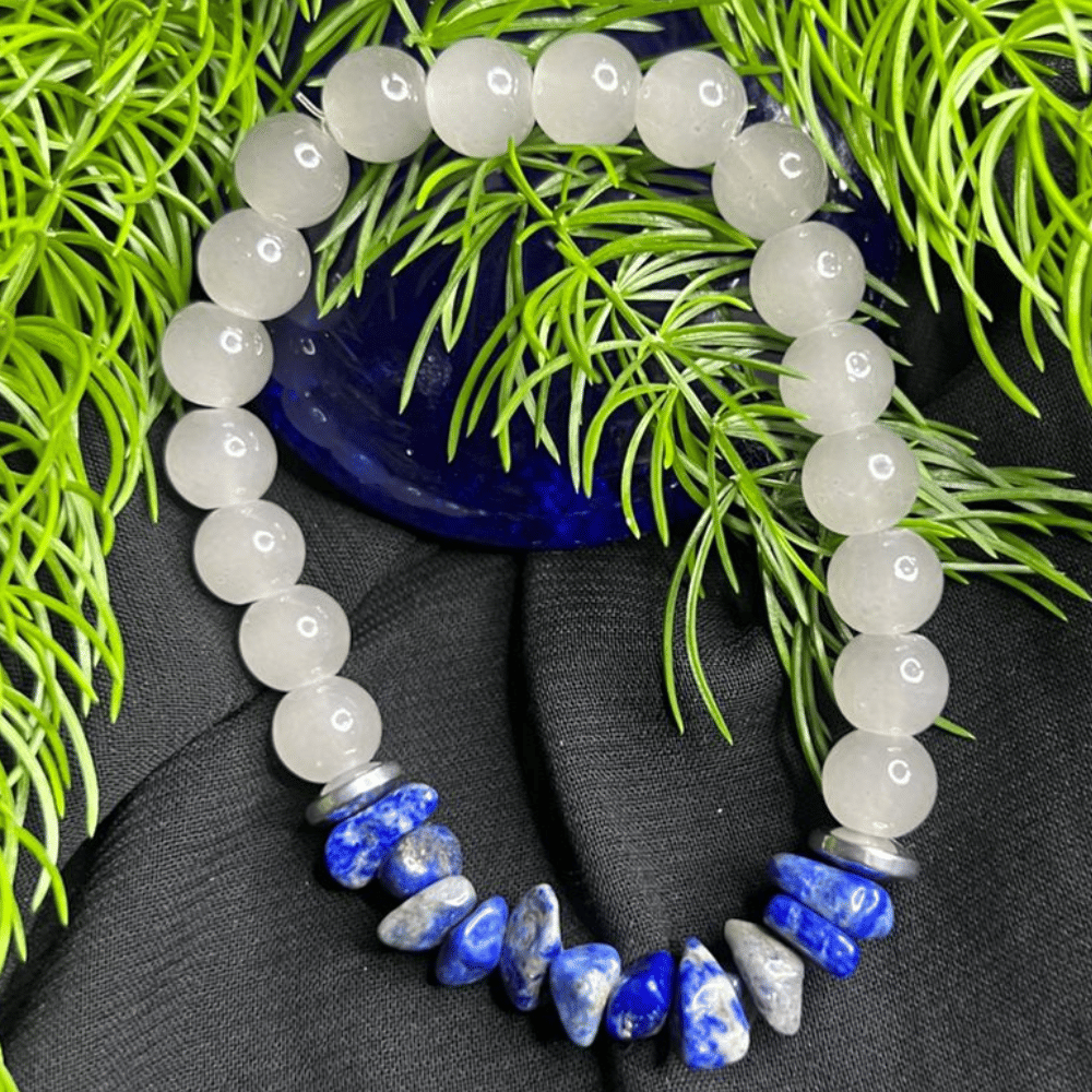 Elevate your style and spirit with this handcrafted bracelet, featuring smooth **white stone beads** and vibrant **blue stone chips**. Designed for both beauty and wellness, white stones are known to promote clarity, emotional balance, and calm focus, while blue stones encourage truth, self-expression, and inner peace.