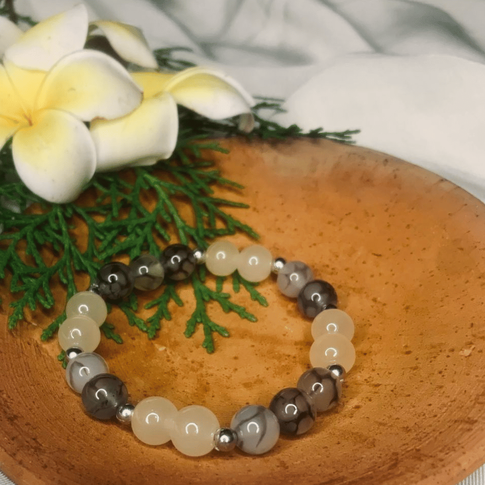 This natural agate gemstone bracelet is designed with a calming blend of gray, white, and cream stone beads, accented by polished silver spacers. Its classic beaded style makes it suitable for both men and women.