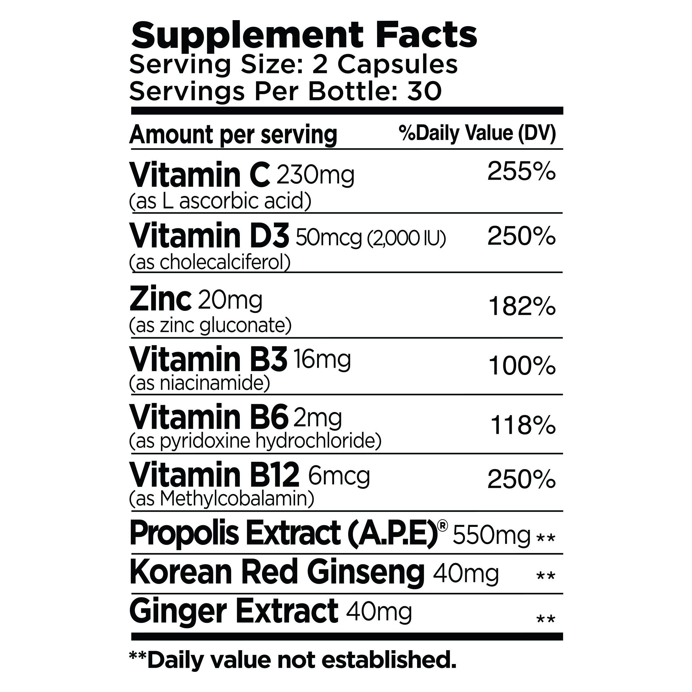 Ingredients: Vitamin C, Vitamin D3, Zinc, Vitamin B3, Vitamin B6, Vitamin B12, Propolis Extract(A.P.E), Korean Red Ginseng, Ginger Extract