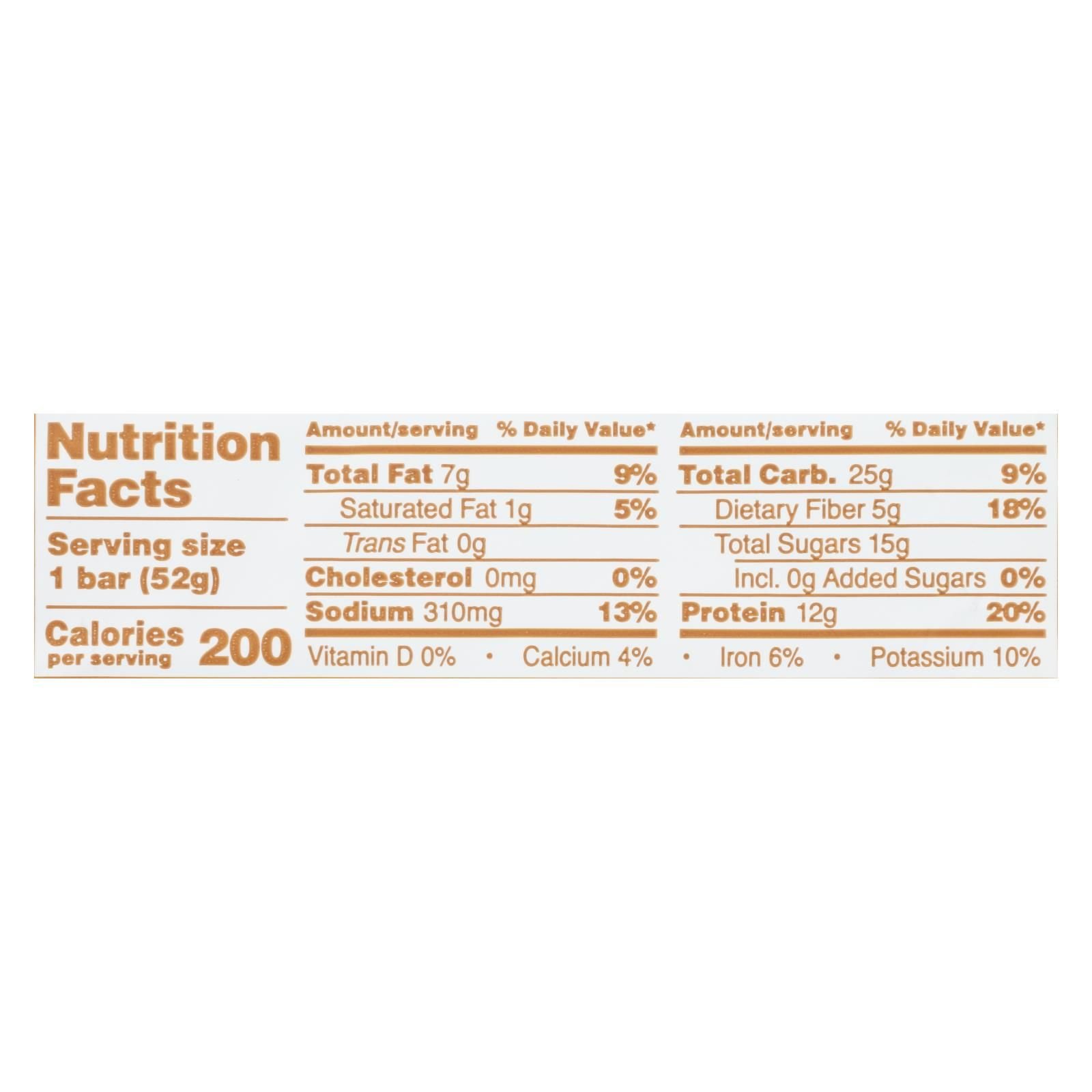 Rxbar protein bar, peanut butter provides gluten-free, all natural goodness. There is no added sugar, dairy, peanuts or soy in this healthy bar. There are three egg whites, six almonds, four cashews, two dates, a dash of sea salt and 12 g. Of protein in every bar. Each bar contains 1.83 oz. Of product and 210 calories.